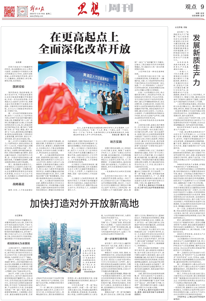 惟改革者进,惟创新者强。改革开放45年来,中国经济发展和社会进步取得举世瞩目的发展成就,形成一系列创新性思路。在更高起点上全面深化改革开放,既要全面分析和把握时代发展条件和趋势,又要系统总结和提炼发展经验,全方位大力度推进首创性改革、引领性开放。