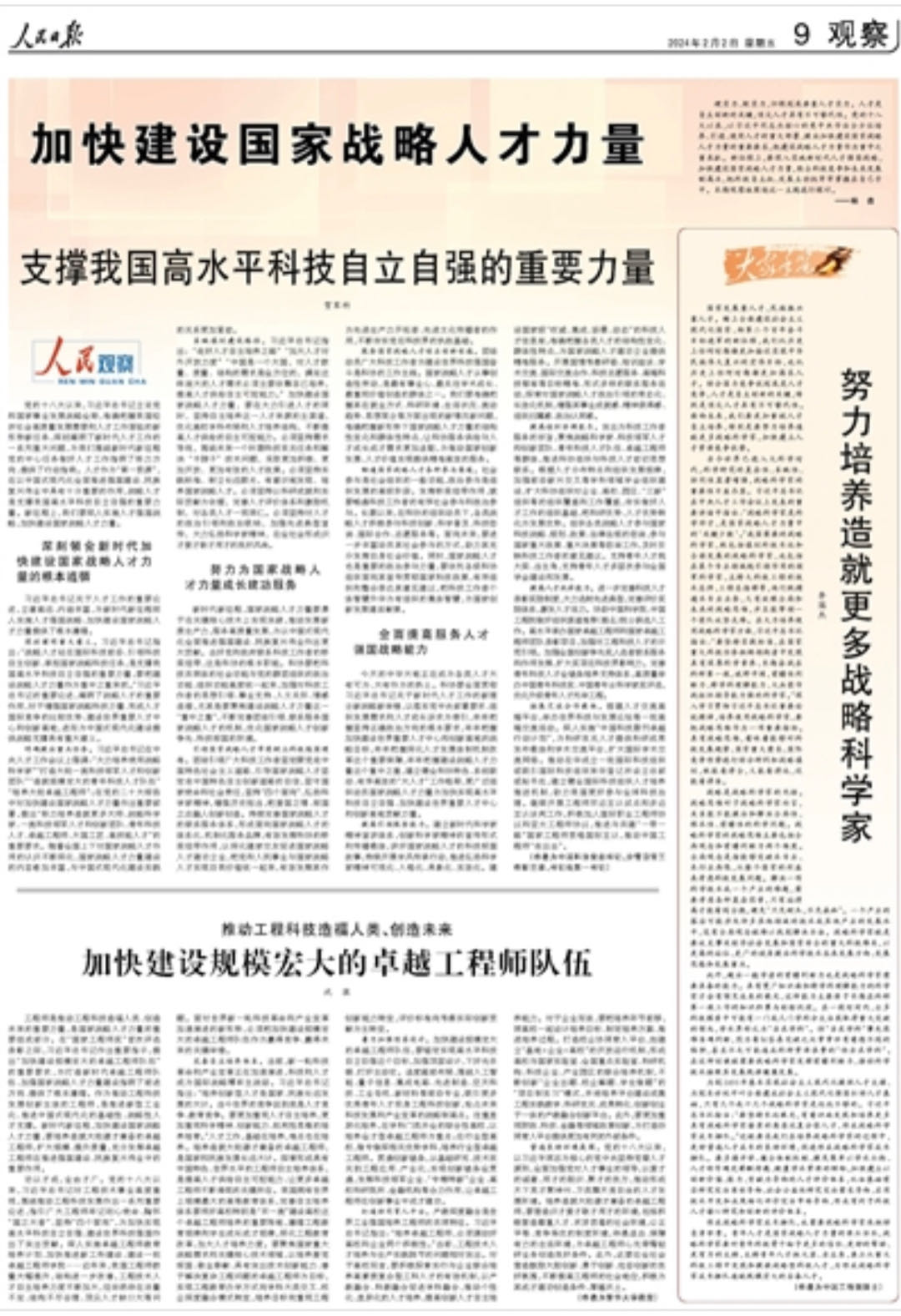 着力加强顶层设计。加快建设规模宏大的卓越工程师队伍,要锚定实现高水平科技自立自强这个目标,加强顶层设计,下好先手棋、打好主动仗。适度超前布局,围绕人工智能、量子信息、集成电路、先进制造、空天科技、工业母机、新材料等前沿专业,吸引更多优秀青年人才投身工程科技创新,抢占未来科技发展和产业变革的战略制高点。注重差异化培养,在学科门类齐全的综合性高校,以培养全才型卓越工程师为重点;在行业型高校,做专做深相关优势学科,培养行业型卓越工程师。贯通创新链条,从基础研究、技术攻关到工程应用、产业化,实现创新链条全贯通,发挥科技领军企业、“专精特新”企业、高校科研院所、金融机构等合力作用,让卓越工程师在创新事业中成才建功。