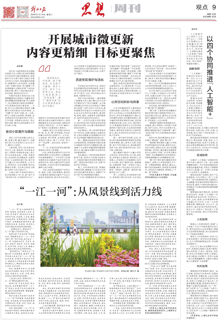 “一江一河”是上海的城市生命线、风景线,也是城市人文线、活力线。新形势下,提升滨水公共空间的参与性、公益性、人文性,提高水面利用率、岸线利用率,加强遗产保护、品牌塑造和精神培育,提升国际知名度、美誉度,是开创人民城市建设新局面的重要课题。