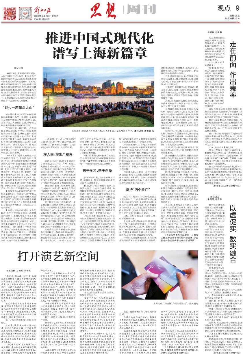 1949年5月,上海城市获得解放、人民获得新生。75年来,上海与新中国同呼吸共命运,在推进马克思主义中国化时代化的历史进程中,在革命、建设和改革的伟大实践中,在中华民族伟大复兴的时代征程中,具有极其重要的战略地位、独特贡献与重大作用。新时代新征程上,在习近平新时代中国特色社会主义思想的科学指引下,上海坚持和弘扬历史主动精神,不断谱写中国式现代化新篇章。