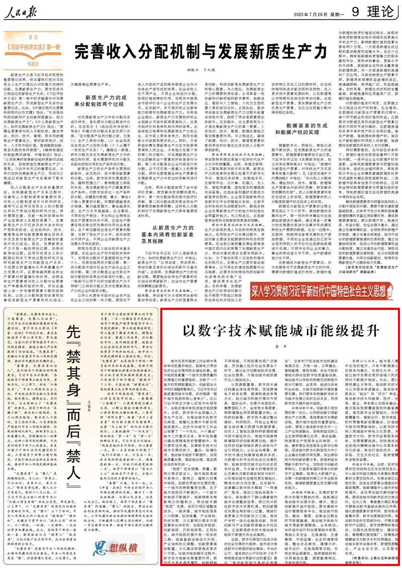 “能级”包含规模、质量、影响力等多层含义,城市能级是城市竞争力、影响力、辐射力的集中体现。回顾世界城市发展历程,一个城市的持续繁荣发展,在于城市能级的不断提升;一个城市的能级不断提升,能够持续发挥影响力和辐射力,带动城市群“抱团”发展,进而引领区域整体进步。一般来看,城市能级是其人口规模、经济体量、产业结构、科技发展、文化影响力等多方面因素综合决定的,包括经济能级、创新能级、开放能级等。正因如此,城市能级的提升是一项系统工程,涵盖基础设施迭代升级、产业结构优化调整、创新要素高效配置、文化建设深度推进等多个方面。在城市能级提升过程中,数字技术能够发挥重要作用。数字技术具有通用属性,能够跨越不同领域、不同场景实现广泛渗透,灵活融入经济社会发展各个环节,通过全方位赋能经济发展、社会治理等,为推动城市能级提升注入强劲动力。